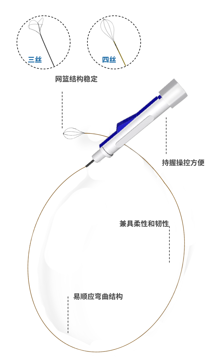 前端開口分三絲、四絲網籃,穩(wěn)定的網籃結構,可輕松套取結石或異物;