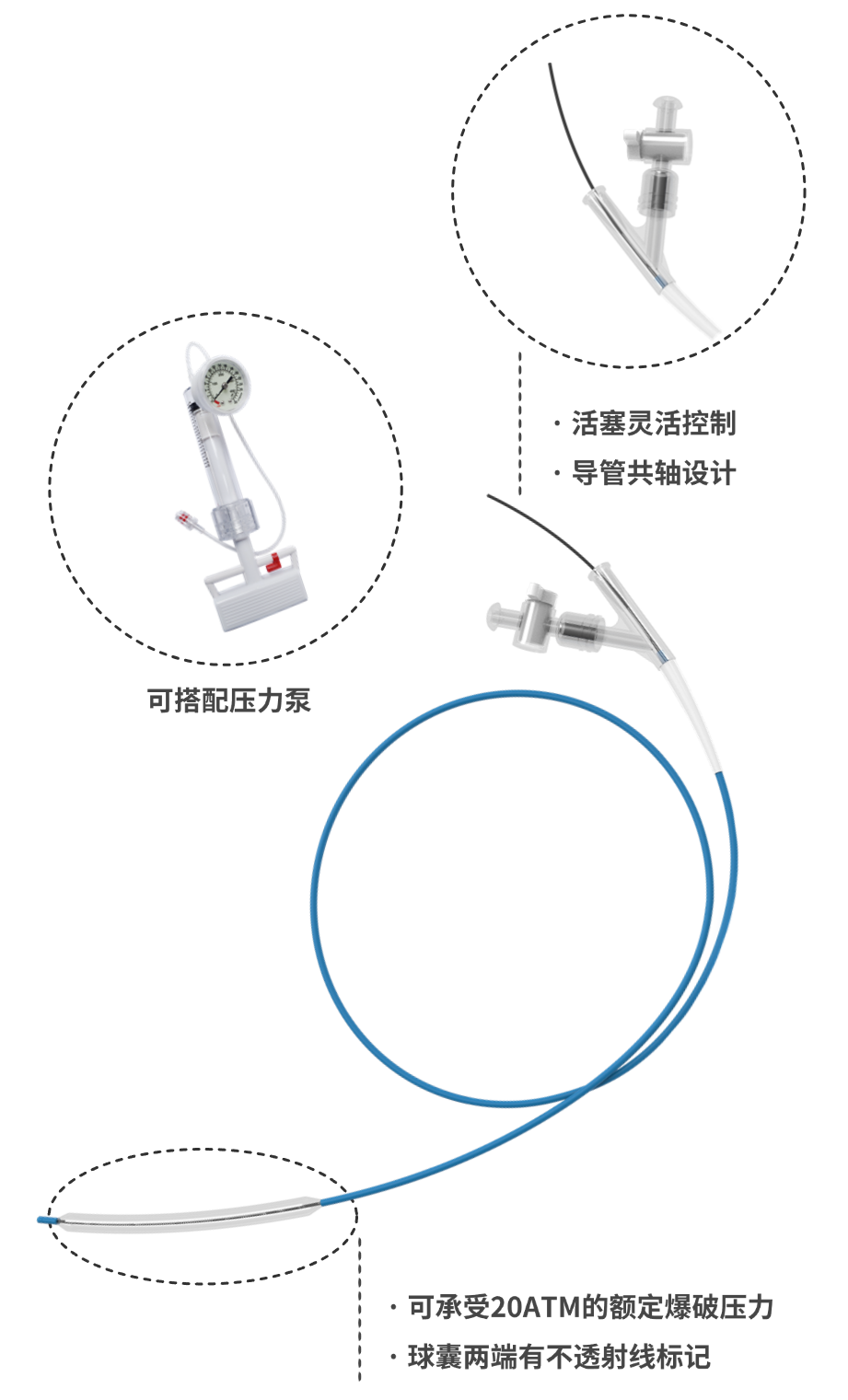 導(dǎo)管共軸設(shè)計(jì),增加推動(dòng)力傳達(dá),使球囊導(dǎo)管在彎曲而狹窄的病變腔道內(nèi)推進(jìn)暢通無(wú)阻;